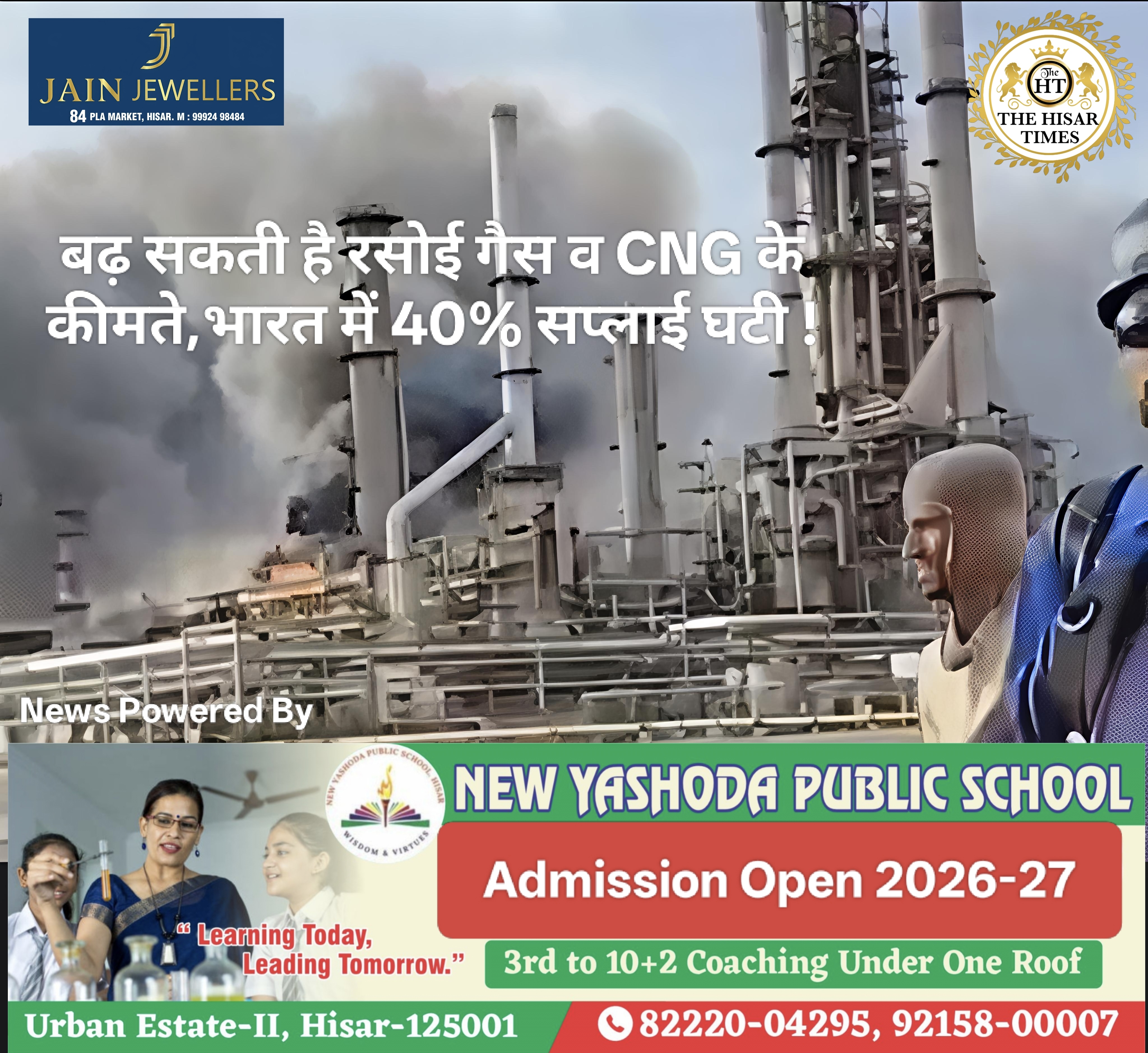 नोट – नीचे कॉलम में देखें > हिसार टाइम्स जॉब्स क्लासिफाइड > आज की बड़ी खबरें फटा फट… For Free Job & News Updates Join Hisar Times News Group https://chat.whatsapp.com/EHzVoGH50MdINoYniG4crH ➖➖➖➖➖➖➖➖➖➖➖➖➖➖➖➖➖➖ हिसार टाइम्स – मिडिल-ईस्ट में चल रहे युद्ध के कारण भारत में CNG (कंप्रेस्ड नेचुरल गैस) और PNG (पाइप्ड नेचुरल गैस) की कीमतें बढ़ … Continue reading बढ़ सकती है रसोई गैस व CNG की कीमते,भारत में 40% सप्लाई घटी !