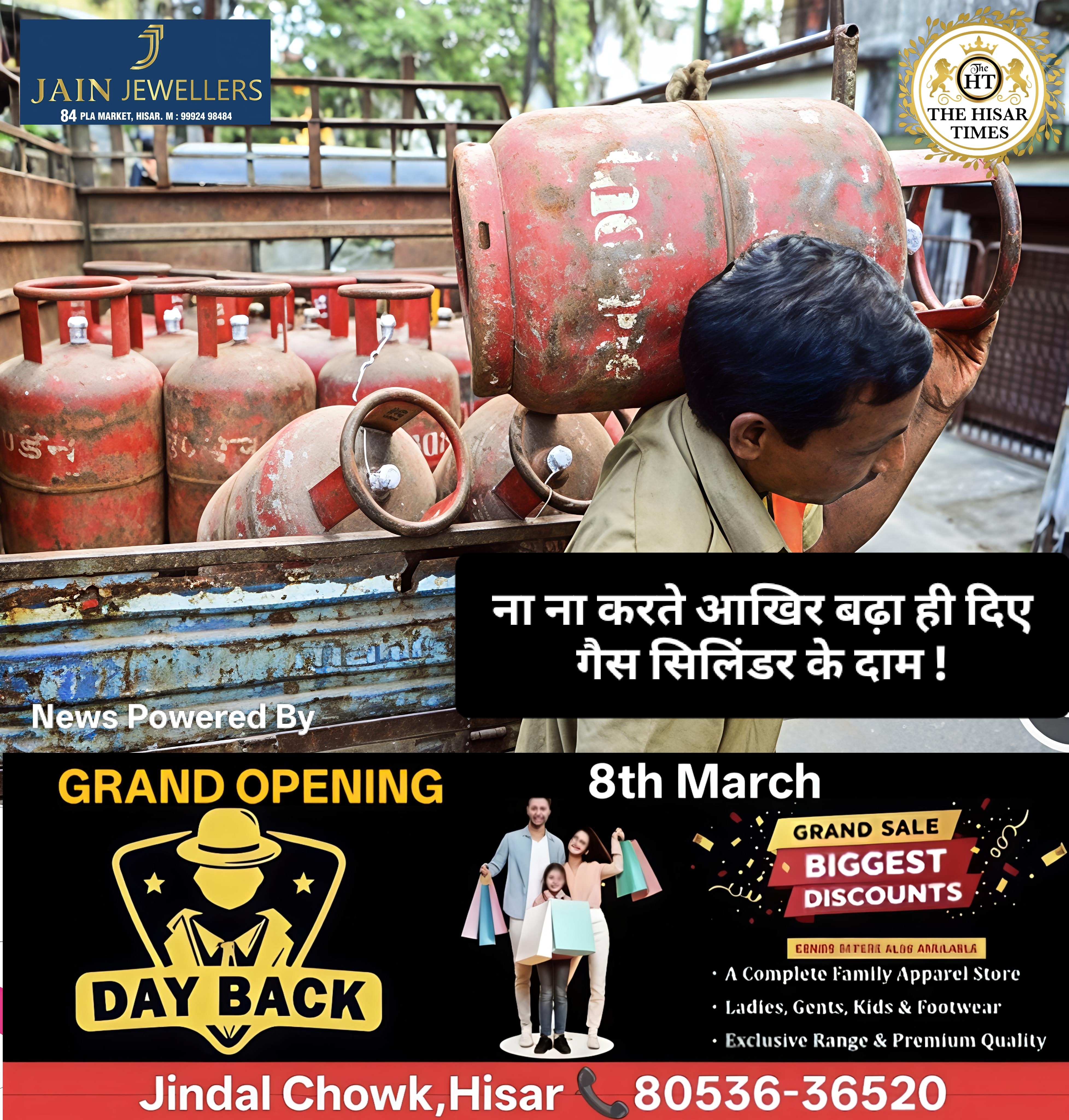 नोट – नीचे कॉलम में देखें > हिसार टाइम्स जॉब्स क्लासिफाइड > आज की बड़ी खबरें फटा फट… For Free Job & News Updates Join Hisar Times News Group https://chat.whatsapp.com/EHzVoGH50MdINoYniG4crH ➖➖➖➖➖➖➖➖➖➖➖➖➖➖➖➖➖➖ हिसार टाइम्स -घरेलू एलपीजी सिलेंडरों की कीमतों में शनिवार, 7 मार्च से वृद्धि कर दी गई है। देश भर में 14.2 किलोग्राम के घरेलू … Continue reading ना ना करते आखिर बढ़ा ही दिए गैस सिलिंडर के दाम !