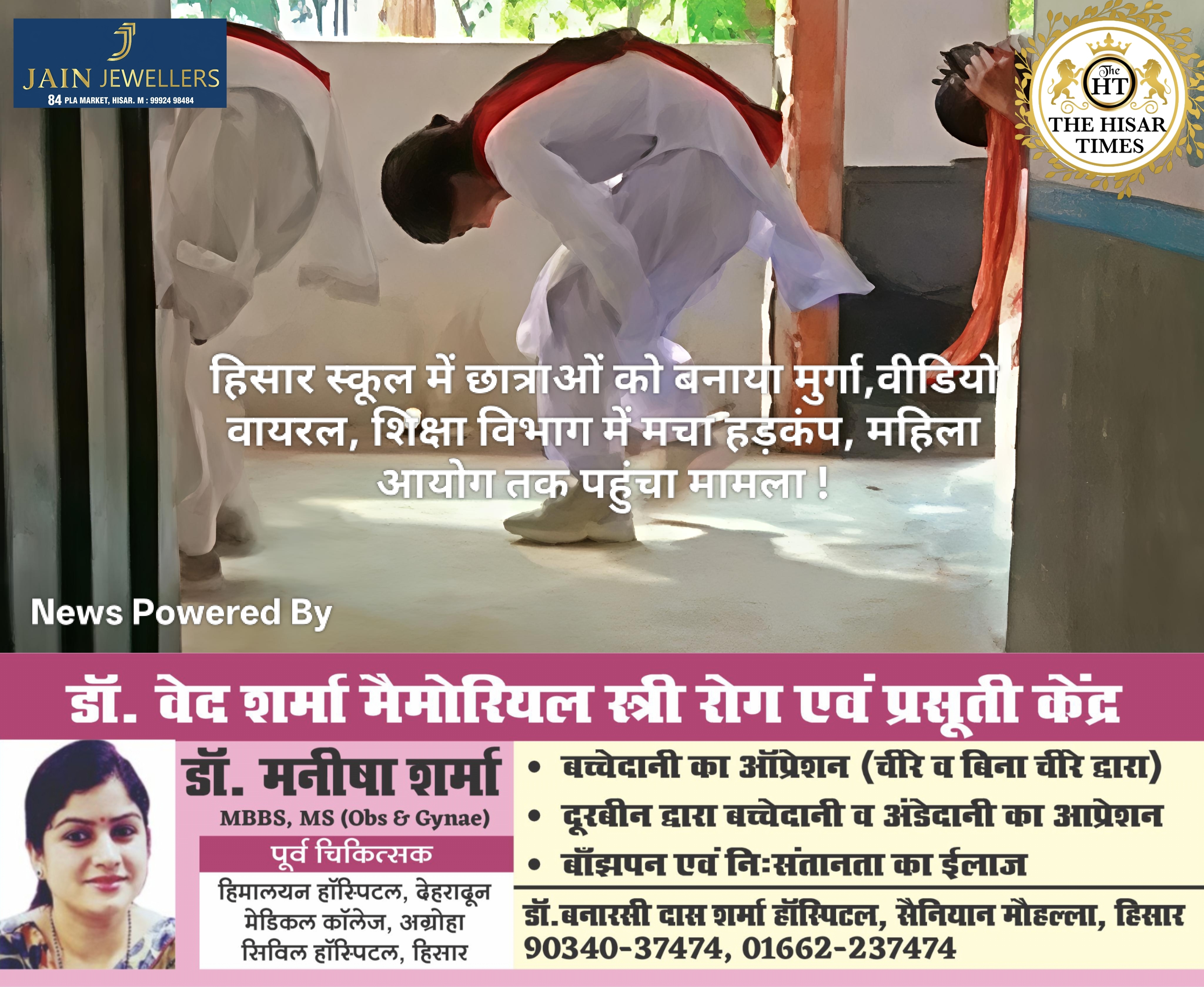 नोट – नीचे कॉलम में देखें > हिसार टाइम्स जॉब्स क्लासिफाइड > आज की बड़ी खबरें फटा फट… For Free Job & News Updates Join Hisar Times News Group https://chat.whatsapp.com/EHzVoGH50MdINoYniG4crH ➖➖➖➖➖➖➖➖➖➖➖➖➖➖➖➖➖➖ हिसार टाइम्स -हिसार के एक राजकीय हाई स्कूल से अनुशासन के नाम पर छात्राओं को अमानवीय सजा देने का एक चौंकाने वाला मामला सामने … Continue reading हिसार स्कूल में छात्राओं को बनाया मुर्गा,वीडियो वायरल, शिक्षा विभाग में मचा हड़कंप, महिला आयोग तक पहुंचा मामला !
