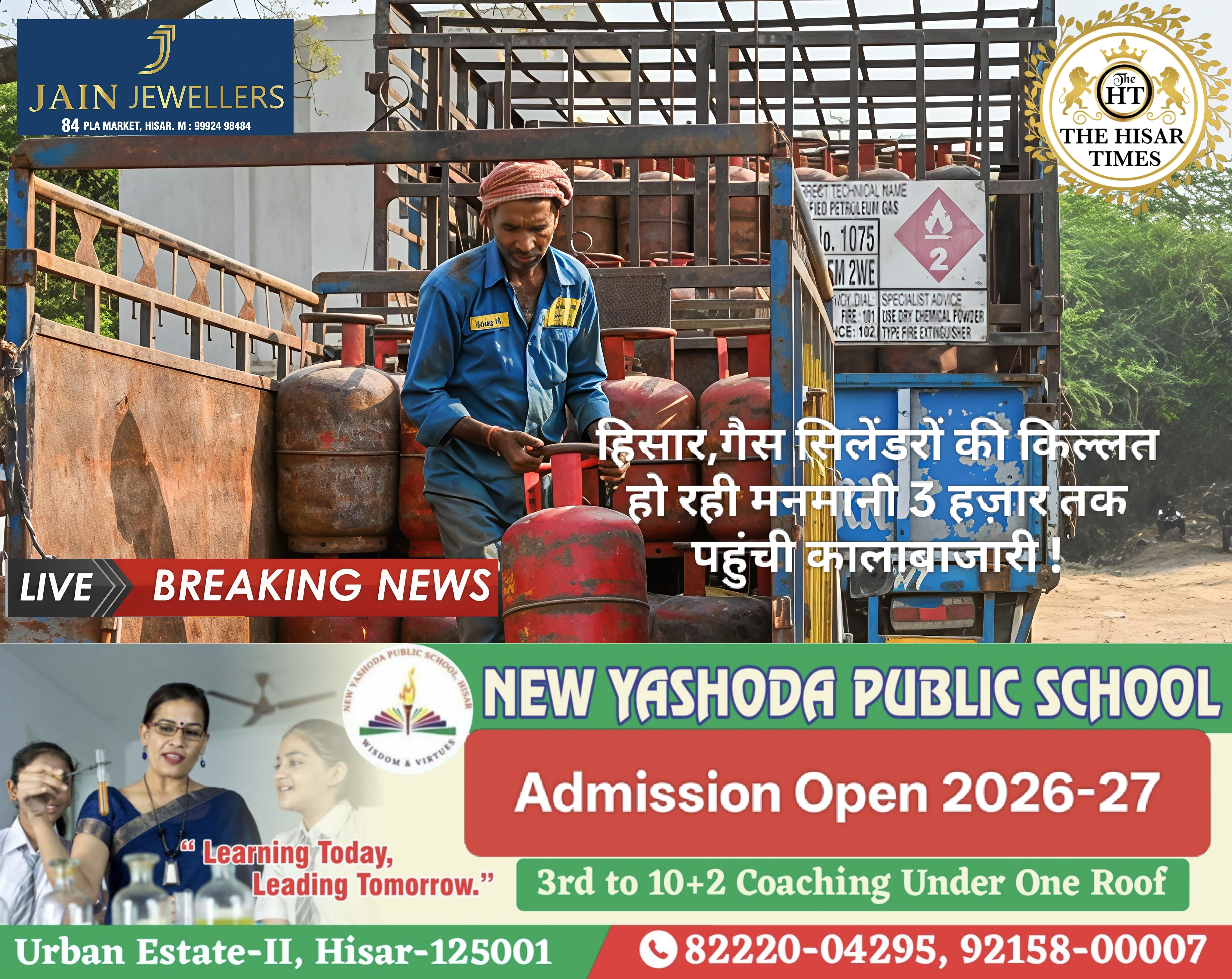 नोट – नीचे कॉलम में देखें > हिसार टाइम्स जॉब्स क्लासिफाइड > आज की बड़ी खबरें फटा फट… For Free Job & News Updates Join Hisar Times News Group https://chat.whatsapp.com/EHzVoGH50MdINoYniG4crH ➖➖➖➖➖➖➖➖➖➖➖➖➖➖➖➖➖➖ हिसार टाइम्स – हिसार शहर में कमर्शियल गैस सिलेंडरों की सप्लाई रुकने से हाहाकार मचा हुआ है। सरकार द्वारा होटल, रेस्टोरेंट और ढाबा संचालकों … Continue reading हिसार,गैस सिलेंडरों की किल्लत 3 हज़ार तक पहुंची कालाबाजारी !