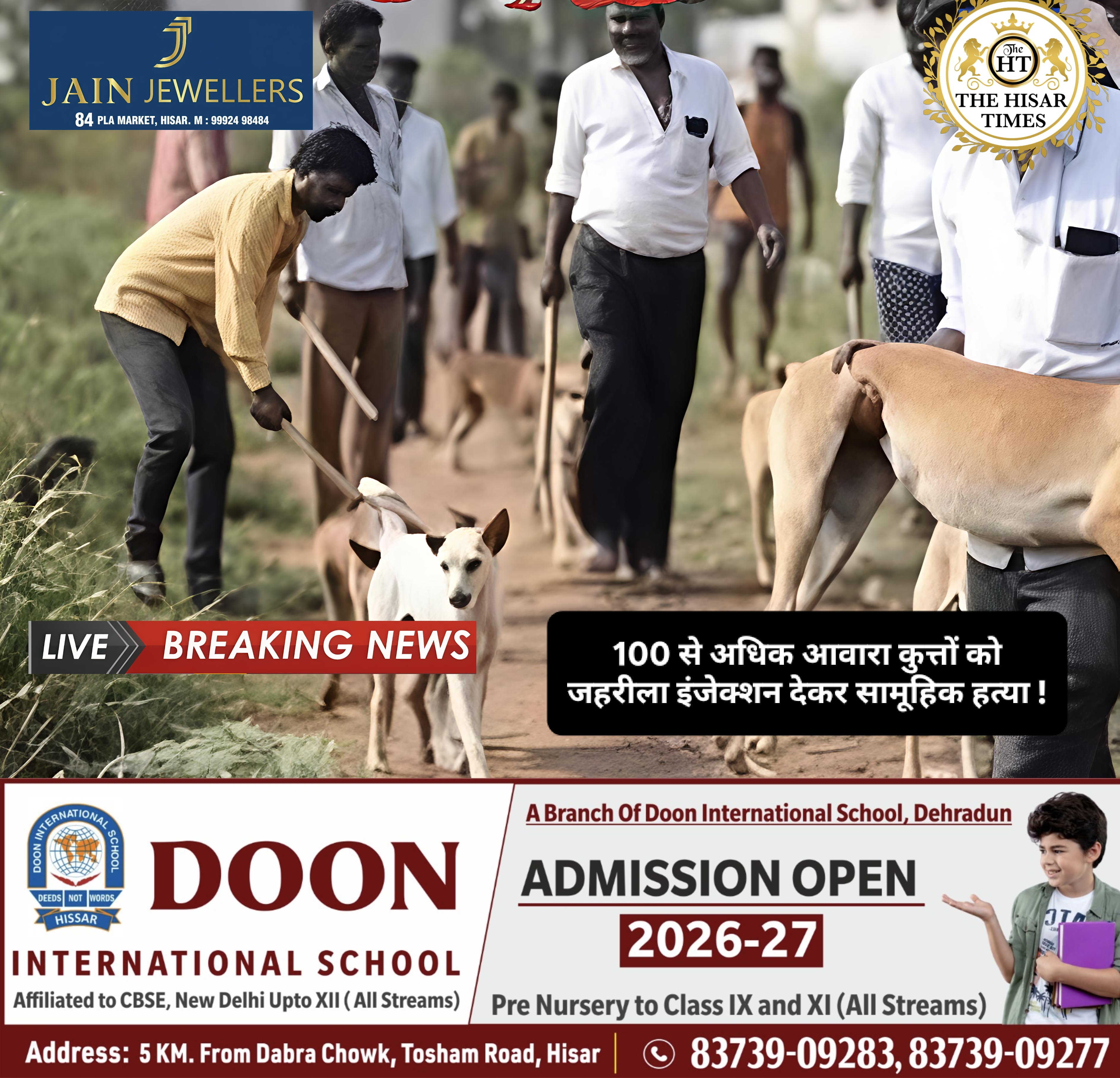 नोट – नीचे कॉलम में देखें > हिसार टाइम्स जॉब्स क्लासिफाइड > आज की बड़ी खबरें फटा फट… For Free Job & News Updates Join Hisar Times News Group https://chat.whatsapp.com/EHzVoGH50MdINoYniG4crH ➖➖➖➖➖➖➖➖➖➖➖➖➖➖➖➖➖➖ हिसार टाइम्स – तेलंगाना के मंचूरियल जिले से एक विचलित करने वाली खबर सामने आई है, जहाँ कथित तौर पर 100 से अधिक आवारा … Continue reading 100 से अधिक आवारा कुत्तों को जहरीला इंजेक्शन देकर सामूहिक हत्या !