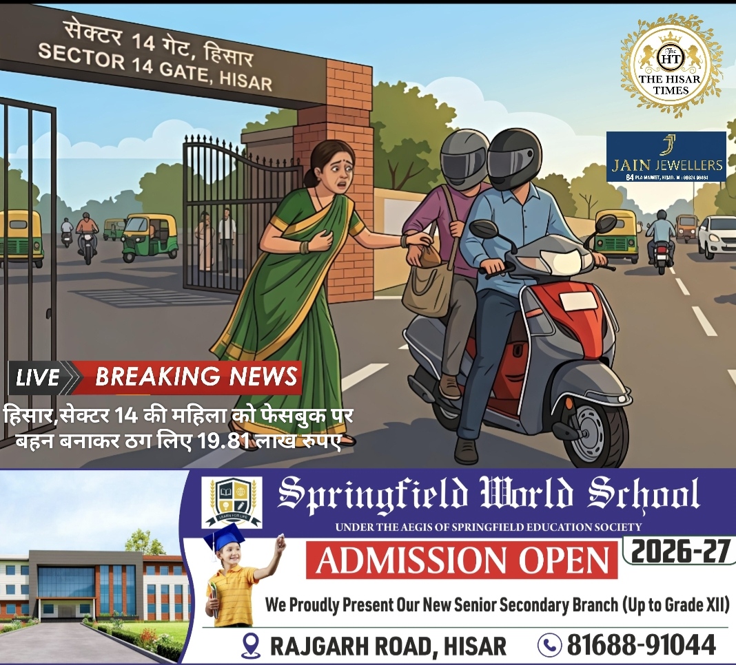 नोट – नीचे कॉलम में देखें > हिसार टाइम्स जॉब्स क्लासिफाइड > आज की बड़ी खबरें फटा फट… For Free Job & News Updates Join Hisar Times News Group https://chat.whatsapp.com/EHzVoGH50MdINoYniG4crH ➖➖➖➖➖➖➖➖➖➖➖➖➖➖➖➖➖➖ हिसार टाइम्स – हिसार के सेक्टर-14 की एक गृहिणी साइबर ठगों के जाल में फंसकर अपनी जीवन भर की जमापूंजी और गोल्ड लोन तक … Continue reading सेक्टर 14 की महिला को फेसबुक पर बहन बनाकर ठग लिए 19.81 लाख रुपए !