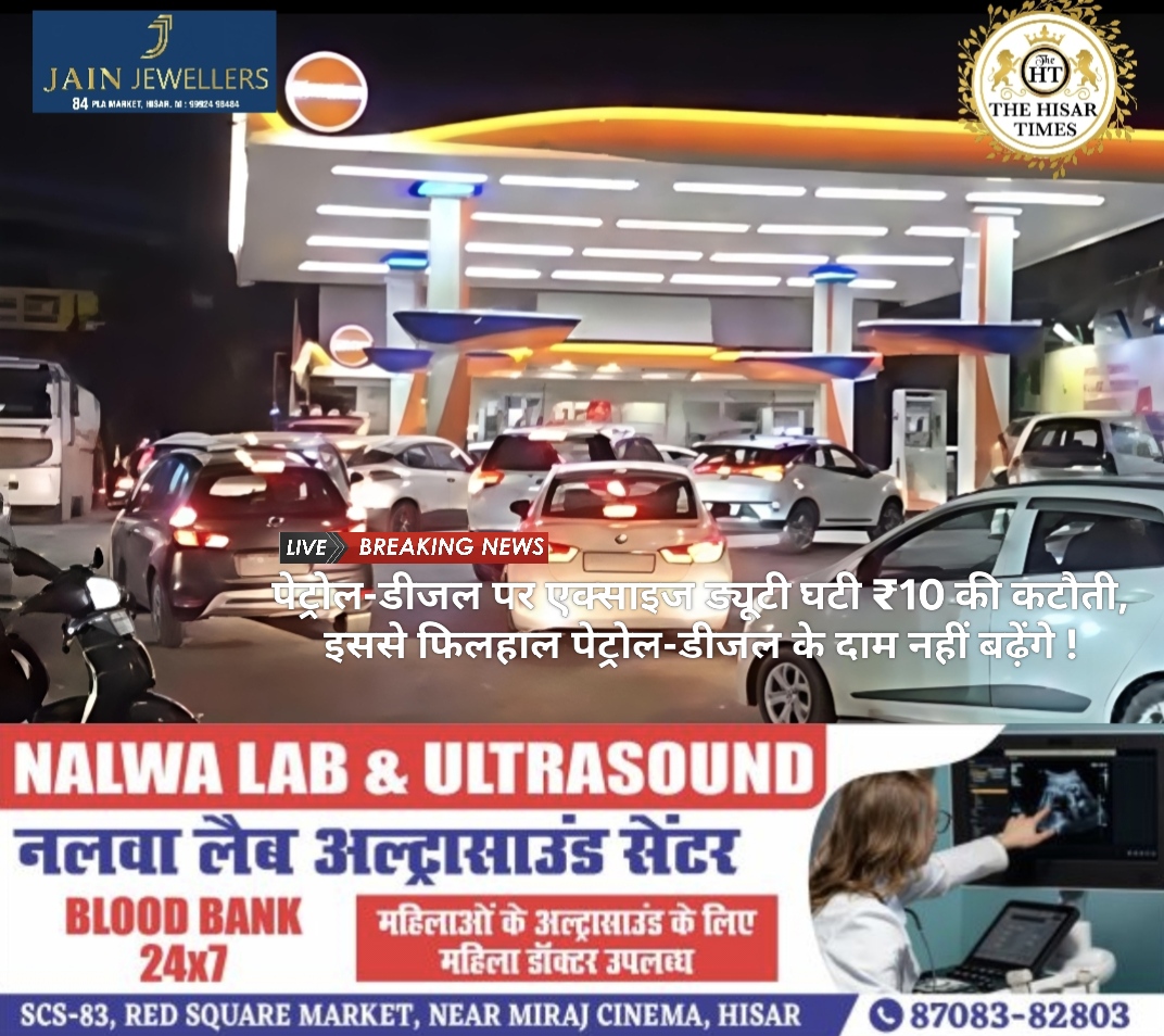 नोट – नीचे कॉलम में देखें > हिसार टाइम्स जॉब्स क्लासिफाइड > आज की बड़ी खबरें फटा फट… For Free Job & News Updates Join Hisar Times News Group https://chat.whatsapp.com/EHzVoGH50MdINoYniG4crH ➖➖➖➖➖➖➖➖➖➖➖➖➖➖➖➖➖➖ हिसार टाइम्स – ग्लोबल कच्चे तेल की आपूर्ति संकट के बीच सरकार ने तेल कंंपनियों को बड़ी राहत दी है. पेट्रोल और डीजल पर … Continue reading पेट्रोल-डीजल पर एक्साइज ड्यूटी घटी ₹10 की कटौती, इससे फिलहाल पेट्रोल-डीजल के दाम नहीं बढ़ेंगे !