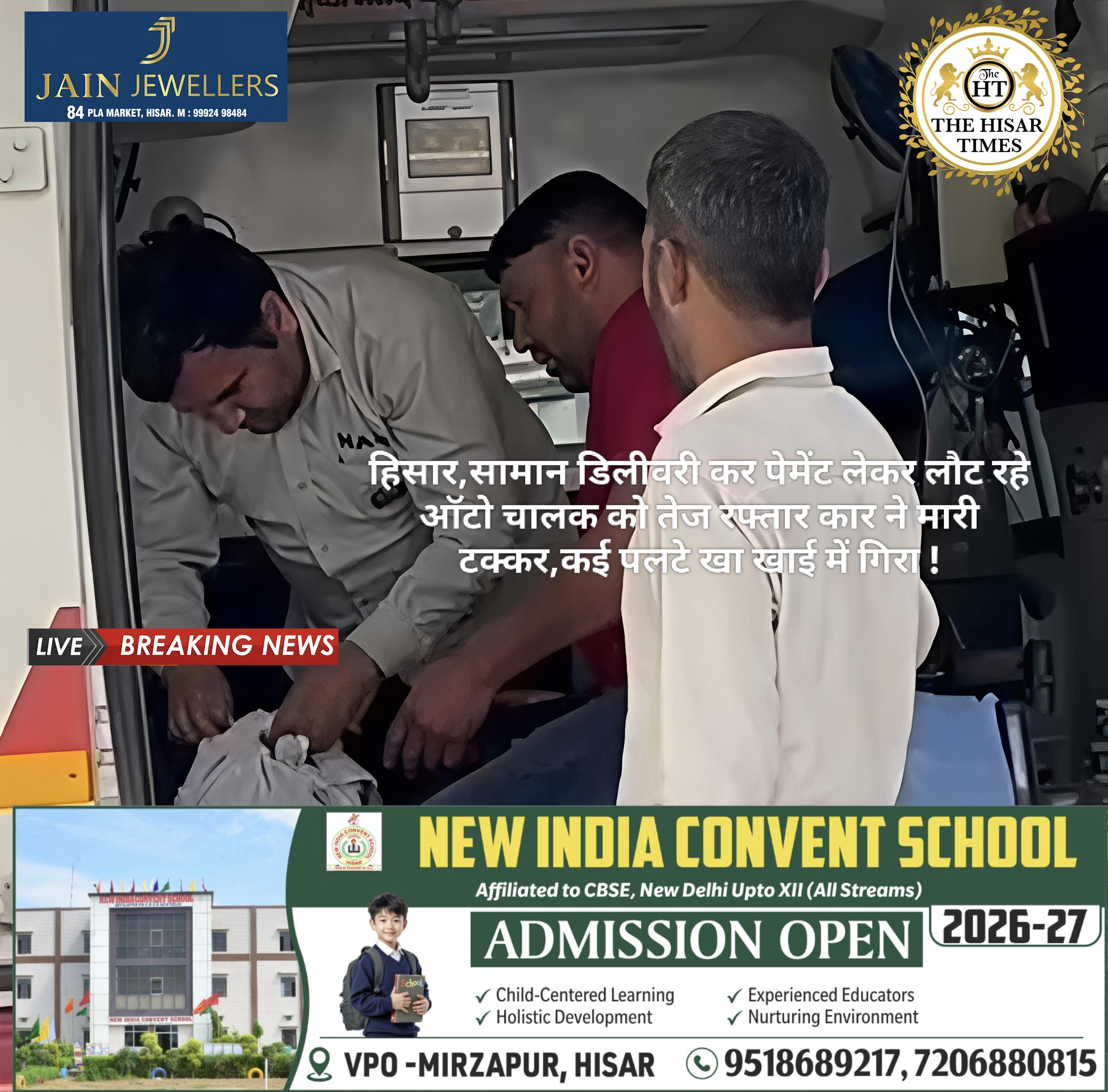 नोट – नीचे कॉलम में देखें > हिसार टाइम्स जॉब्स क्लासिफाइड > आज की बड़ी खबरें फटा फट… For Free Job & News Updates Join Hisar Times News Group https://chat.whatsapp.com/ KZAUnIqUoH3DeiKAHjebqK ➖➖➖➖➖➖➖➖➖➖➖➖➖➖➖➖ हांसी में भीषण सड़क हादसा: तेज रफ्तार कार ने ऑटो को मारी टक्कर, चालक गंभीर रूप से घायल हिसार टाइम्स – हांसी के … Continue reading हिसार,सामान डिलीवरी कर पेमेंट लेकर लौट रहे ऑटो चालक को तेज रफ्तार कार ने मारी टक्कर,कई पलटे खा खाई में गिरा !