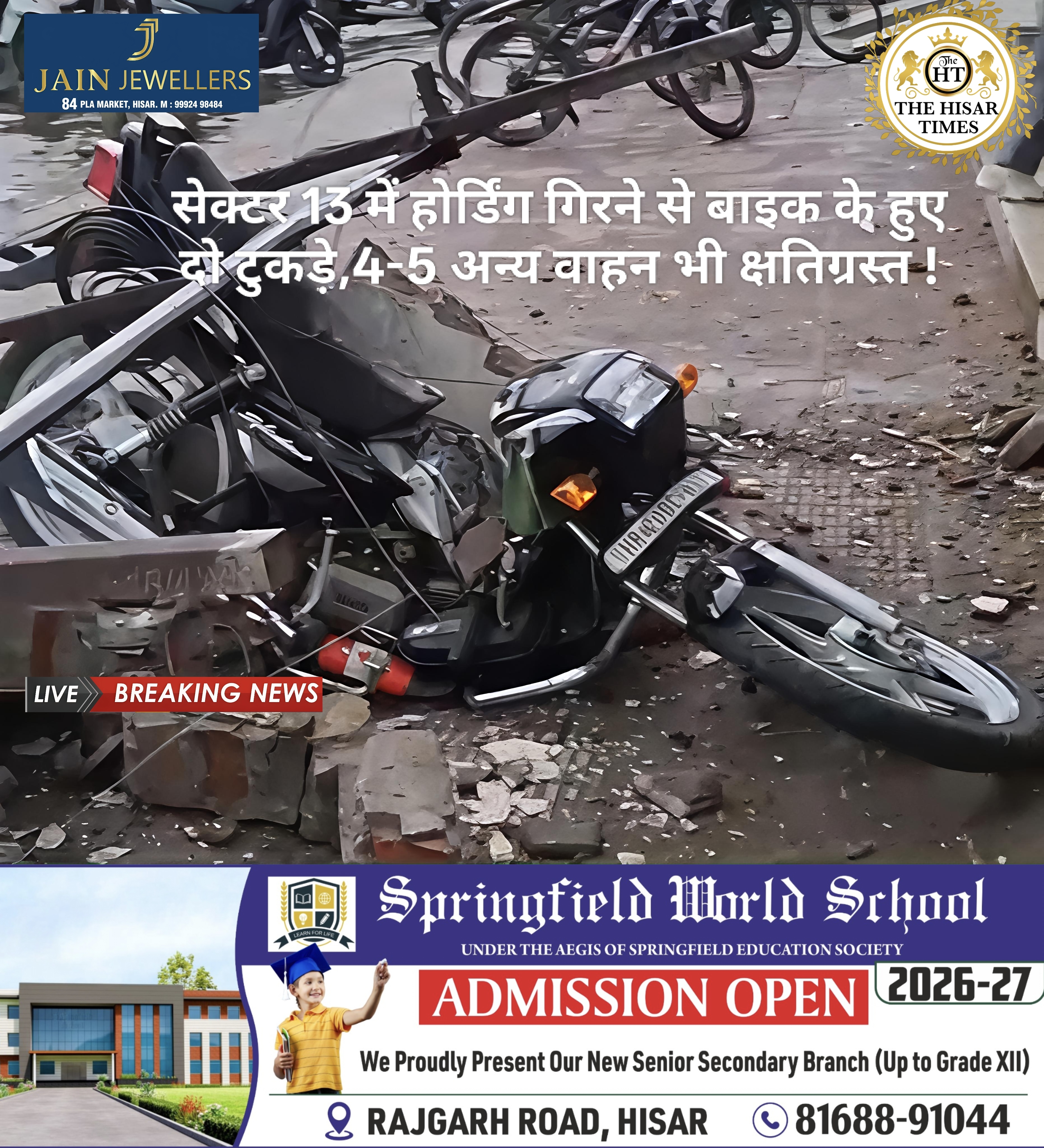 नोट – नीचे कॉलम में देखें > हिसार टाइम्स जॉब्स क्लासिफाइड > आज की बड़ी खबरें फटा फट… For Free Job & News Updates Join Hisar Times News Group https://chat.whatsapp.com/ EHzVoGH50MdINoYniG4crH ➖➖➖➖➖➖➖➖➖➖➖➖➖➖➖➖➖➖ हिसार टाइम्स – हिसार के सेक्टर 13 स्थित कमर्शियल मार्केट में मंगलवार को बारिश और तेज हवाओं के चलते एक खौफनाक मंजर देखने … Continue reading सेक्टर 13 में होर्डिंग गिरने से बाइक के हुए दो टुकड़े,4-5 अन्य वाहन भी क्षतिग्रस्त !