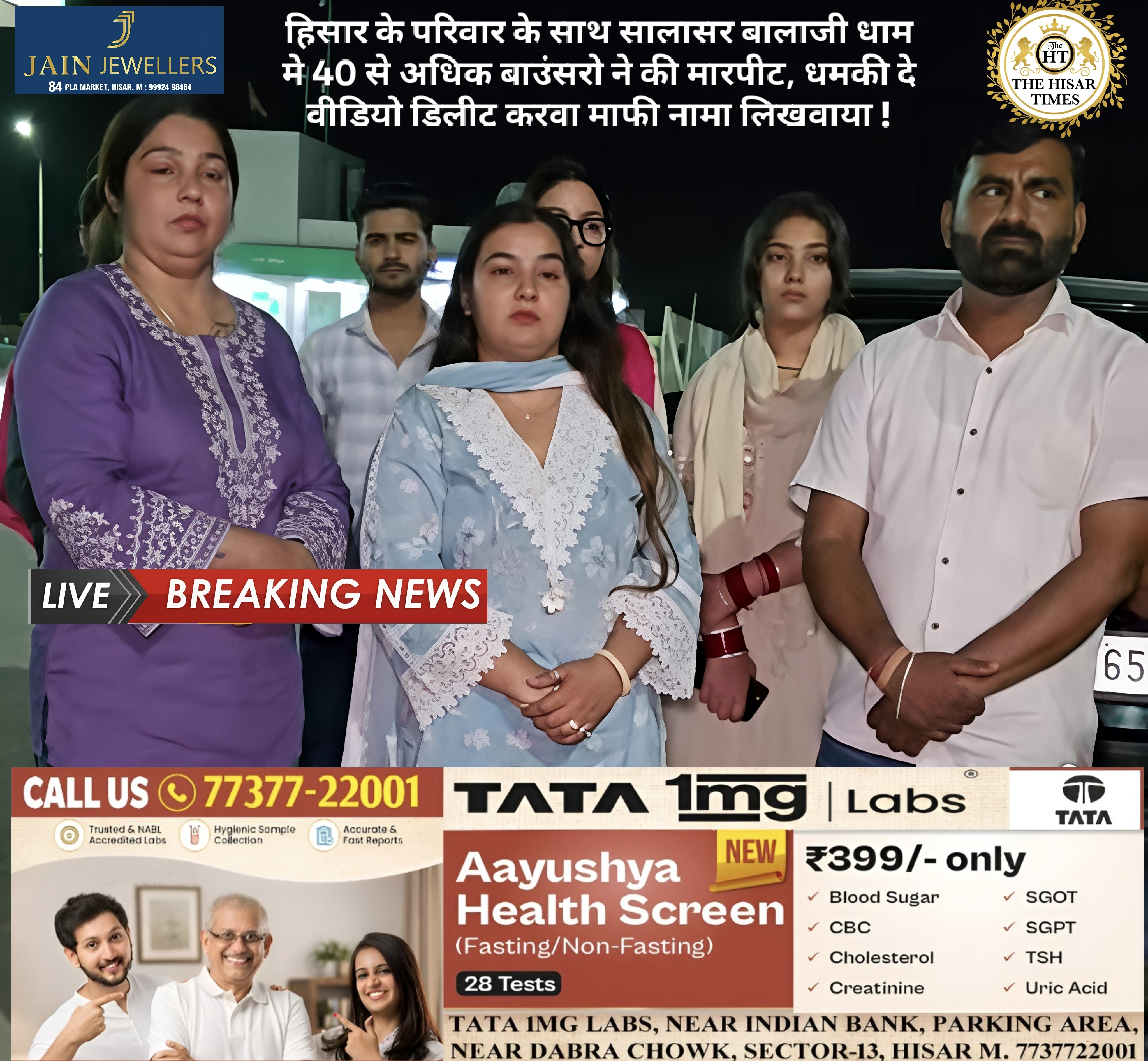 नोट – नीचे कॉलम में देखें > हिसार टाइम्स जॉब्स क्लासिफाइड > आज की बड़ी खबरें फटा फट… For Free Job & News Updates Join Hisar Times News Group https://chat.whatsapp.com/ EHzVoGH50MdINoYniG4crH ➖➖➖➖➖➖➖➖➖➖➖➖➖➖➖➖➖➖ चंदे के 5100 रुपए दिए बिना सालासर मंदिर में हिसार के परिवार को वीडियो बनाने को लेकर मारपीट पुलिस बुलाकर पीटा गया, कमरे … Continue reading हिसार के परिवार के साथ सालासर बालाजी धाम मे 40 से अधिक बाउंसरो ने की मारपीट, धमकी दे वीडियो डिलीट करवा माफी नामा लिखवाया !