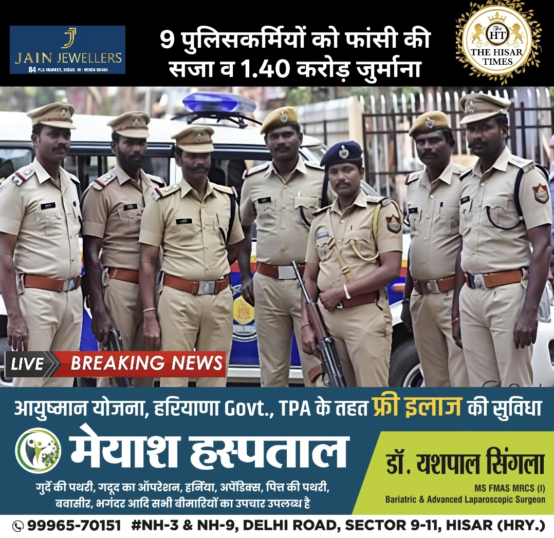 नोट – नीचे कॉलम में देखें > हिसार टाइम्स जॉब्स क्लासिफाइड > आज की बड़ी खबरें फटा फट… For Free Job & News Updates Join Hisar Times News Group https://chat.whatsapp.com/ EHzVoGH50MdINoYniG4crH ➖➖➖➖➖➖➖➖➖➖➖➖➖➖➖➖ तमिलनाडु कस्टोडियल डेथ मामला: 9 पुलिसकर्मियों को फांसी की सजा ऐतिहासिक फैसला और भारी जुर्माना हिसार टाइम्स – मदुरै की प्रथम अतिरिक्त जिला … Continue reading 9 पुलिसकर्मियों को फांसी की सजा व 1.40 करोड़ जुर्माना, लॉकडाउन के दौरान पिता पुत्र की हिरासत में हुई थी मौत !