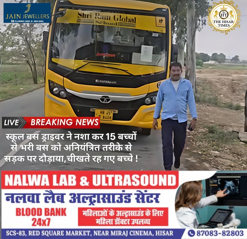 हिसार टाइम्स – करनाल के नेवल रोड पर मंगलवार सुबह एक बड़ी अनहोनी टल गई जब श्रीराम ग्लोबल स्कूल के एक चालक ने शराब के नशे में धुत होकर 15 बच्चों से भरी बस को अनियंत्रित तरीके से सड़क पर दौड़ाया । बस को डगमगाते देख एक एक्सयूवी सवार युवक ने साहस दिखाते हुए बस को रुकवाया और बच्चों को अपनी गाड़ी में बैठाकर सुरक्षित स्कूल पहुंचाया । आरोपी चालक ने खुद स्वीकार किया कि वह चंडीगढ़ से शराब पीकर आया था और वह मौके पर खड़ा होकर लड़खड़ाता नजर आया । शिक्षा विभाग के अधिकारी रोहतास वर्मा ने इस गंभीर लापरवाही पर कड़ा संज्ञान लेते हुए ड्राइवर और स्कूल प्रबंधन दोनों के खिलाफ नियमानुसार कार्रवाई करने के निर्देश जारी किए हैं ।