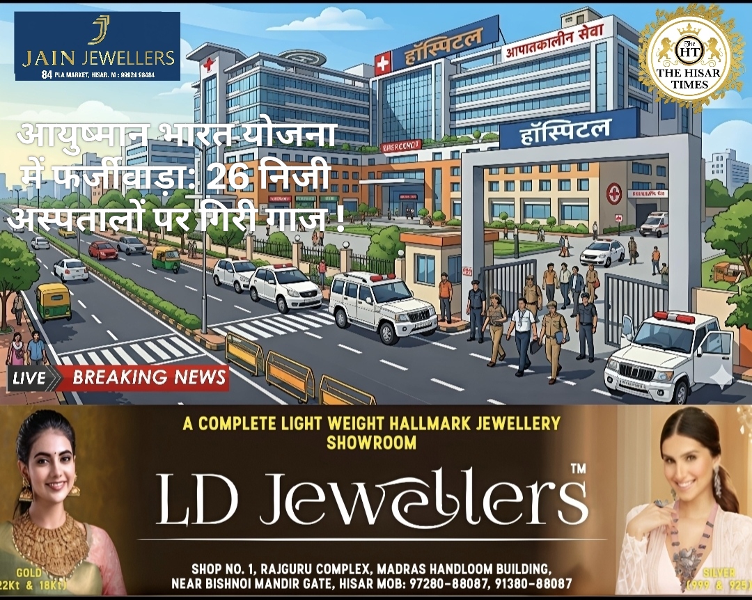 नोट – नीचे कॉलम में देखें > हिसार टाइम्स जॉब्स क्लासिफाइड > आज की बड़ी खबरें फटा फट… For Free Job & News Updates Join Hisar Times News Group https://chat.whatsapp.com/ EHzVoGH50MdINoYniG4crH ➖➖➖➖➖➖➖➖➖➖➖➖➖➖➖➖➖➖ हिसार टाइम्स – हिसार में आयुष्मान भारत योजना के तहत पैनल में शामिल 26 निजी अस्पतालों के खिलाफ अनियमितताओं की शिकायतें मिली हैं … Continue reading आयुष्मान भारत योजना में फर्जीवाड़ा: 26 निजी अस्पतालों पर गिरी गाज !