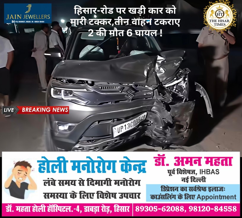 हिसार टाइम्स – रविवार देर शाम करीब 6:30 बजे रामायण टोल के पास एक दर्दनाक सड़क हादसा हुआ, जिसमें दो व्यक्तियों की जान चली गई और छह अन्य घायल हो गए । जानकारी के अनुसार, सोनीपत से एक शादी समारोह में शामिल होने आ रहे बारातियों की स्विफ्ट कार सड़क किनारे खड़ी थी । इसी दौरान पीछे से आ रही एक तेज रफ्तार ब्रेजा कार ने स्विफ्ट को जोरदार टक्कर मार दी, जिससे स्विफ्ट कार उछलकर आगे खड़े एक ऑटो रिक्शा से जा टकराई ।