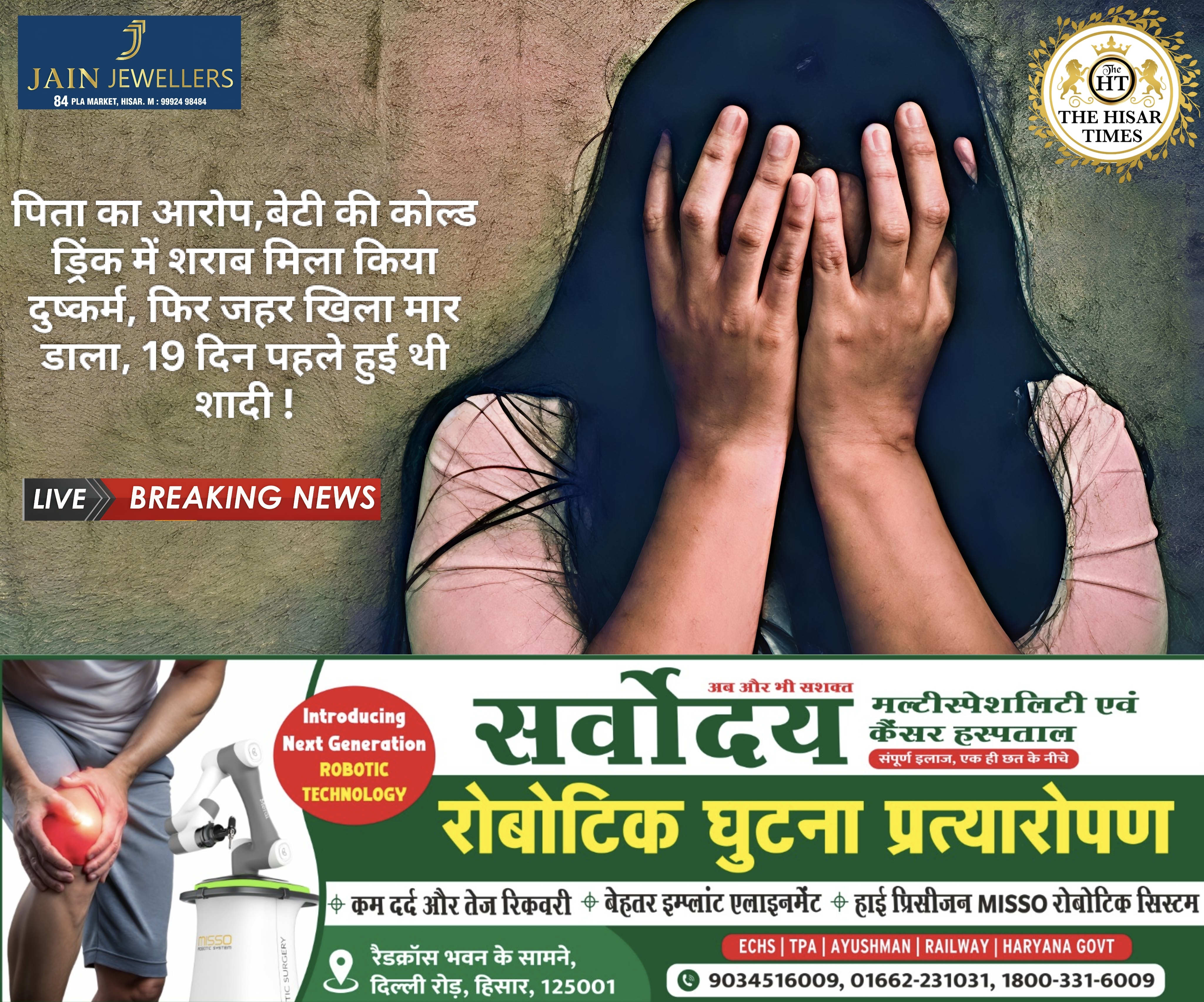 नोट – नीचे कॉलम में देखें > हिसार टाइम्स जॉब्स क्लासिफाइड > आज की बड़ी खबरें फटा फट… For Free Job & News Updates Join Hisar Times News Group https://chat.whatsapp.com/ EHzVoGH50MdINoYniG4crH ➖➖➖➖➖➖➖➖➖➖➖➖➖➖➖➖➖➖ हिसार टाइम्स – हिसार के सरसौद गांव में एक ही दिन एक युवक और एक युवती की संदिग्ध परिस्थितियों में मौत का सनसनीखेज … Continue reading पिता का आरोप,बेटी की कोल्ड ड्रिंक में शराब मिला किया दुष्कर्म, फिर जहर खिला मार डाला, 19 दिन पहले हुई थी शादी !