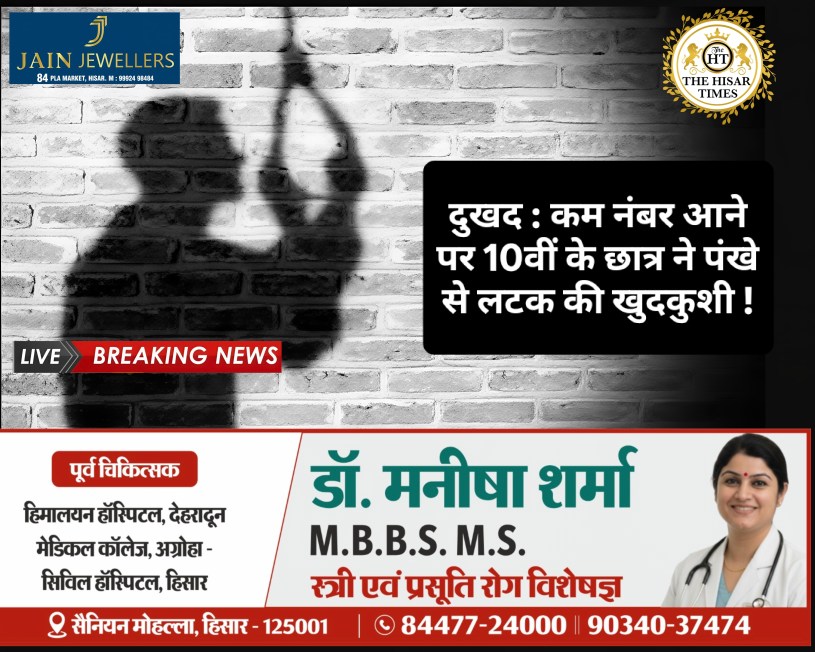हिसार टाइम्स – गुरुग्राम के पटौदी मंडी स्थित बाबा हरदेवा कॉलोनी में एक हृदय विदारक घटना सामने आई है, जहाँ सीबीएसई (CBSE) बोर्ड की 10वीं कक्षा के एक छात्र ने परीक्षा में कम अंक आने से क्षुब्ध होकर मौत को गले लगा लिया । मृतक की पहचान कुणाल के रूप में हुई है, जो एमडी सीनियर सेकेंडरी स्कूल का छात्र था । बुधवार शाम करीब 4:30 बजे जब परीक्षा परिणाम घोषित हुआ,