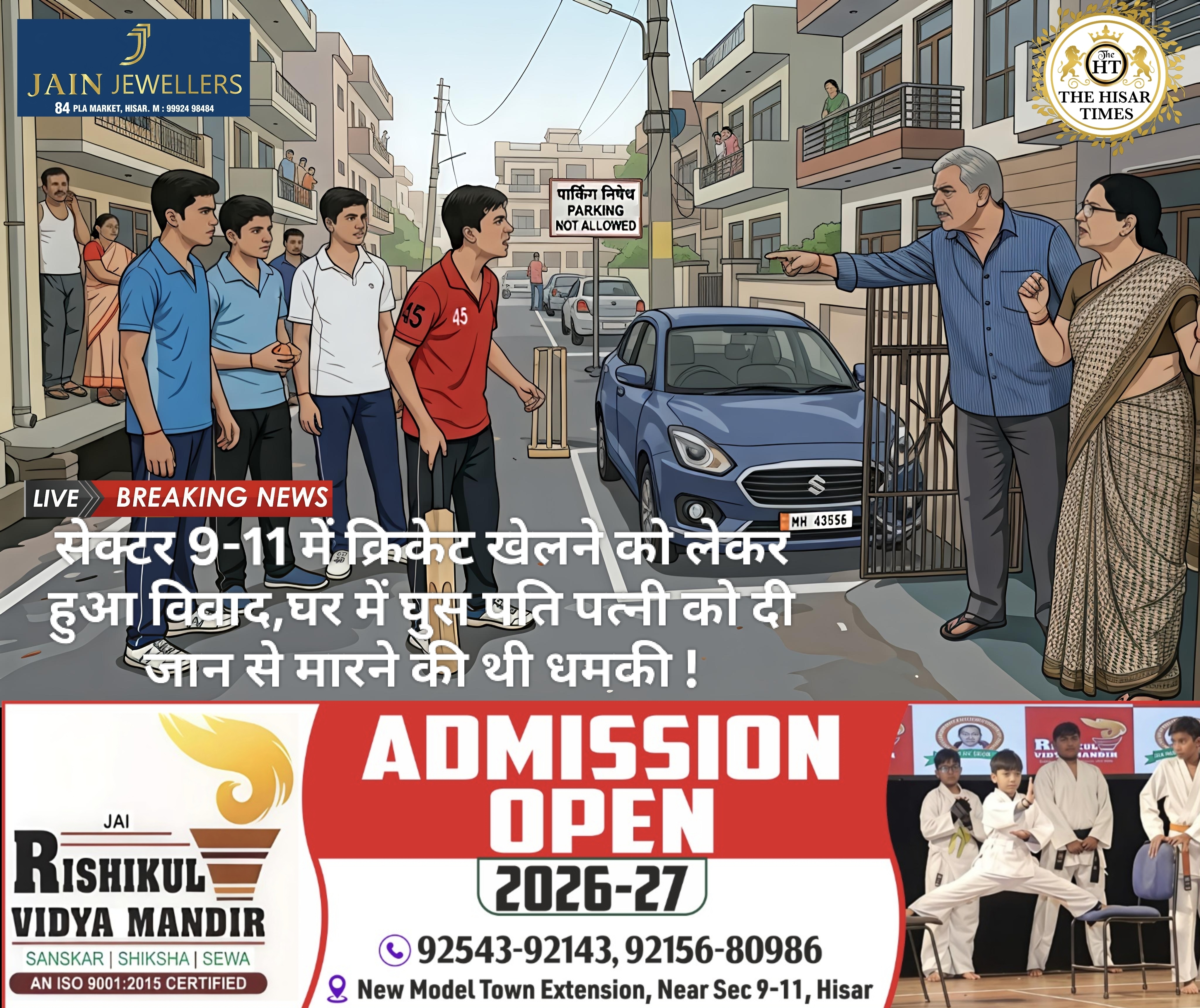 नोट – नीचे कॉलम में देखें > हिसार टाइम्स जॉब्स क्लासिफाइड > आज की बड़ी खबरें फटा फट… For Free Job & News Updates Join Hisar Times News Group https://chat.whatsapp.com/ EHzVoGH50MdINoYniG4crH ➖➖➖➖➖➖➖➖➖➖➖➖➖➖➖➖ हिसार टाइम्स – शहर के सेक्टर 9-11 में शनिवार को कुछ युवक एक घर घुस गए और दंपती के साथ गाली-गलौज कर जान … Continue reading सेक्टर 9-11 में क्रिकेट खेलने को लेकर हुआ विवाद,घर में घुस पति पत्नी को दी जान से मारने की धमकी !
