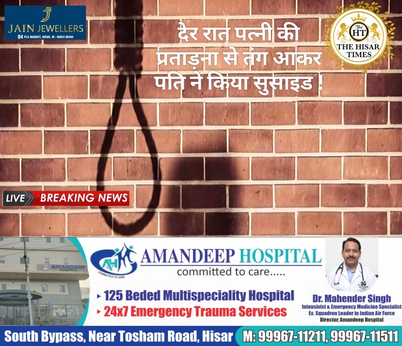 हिसार टाइम्स – आदर्श नगर में शनिवार रात एक युवक ने चुन्नी से फंदा लगाकर जान दे दी। परिजनों ने युवक की मौत के लिए उसकी पत्नी को जिम्मेदार ठहराया है। एचटीएम थाने से जांच अधिकारी देवेंद्र सिंह ने बताया कि मामले में युवक की पत्नी के खिलाफ प्राथमिकी दर्ज की गई है। पुलिस को दी शिकायत में आदर्श नगर की गली नंबर 4 निवासी रामबक्श ने बताया कि उनकी किराना की दुकान है। उसके दो बेटे हैं। बड़े का नाम धमेंद्र व छोटे का नाम अंकित है।
