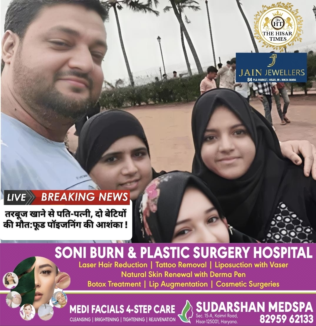 नोट – नीचे कॉलम में देखें > हिसार टाइम्स जॉब्स क्लासिफाइड > आज की बड़ी खबरें फटा फट… For Free Job & News Updates Join Hisar Times News Group https://chat.whatsapp.com/ EHzVoGH50MdINoYniG4crH ➖➖➖➖➖➖➖➖➖➖➖➖➖➖➖➖ हिसार टाइम्स – मुंबई के जे.जे. मार्ग इलाके में एक ही परिवार के चार सदस्यों की तरबूज खाने से मौत हो गई। मृतकों … Continue reading तरबूज खाने से पति-पत्नी, दो बेटियों की मौत:फूड पॉइजनिंग की आशंका !